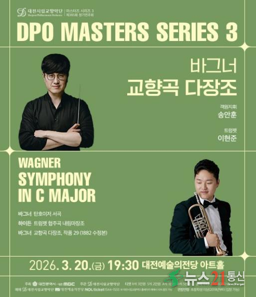 대전시립교향악단은 20일(금) 오후 7시 30분, 대전예술의전당 아트홀에서 마스터즈시리즈 3‘바그너 교향곡 다장조’를 선보인다. 이번 공연은 독일 현지에서 독보적인 입지를 다진 두 음악가, 지휘자 송안훈과 트럼펫터 이현준을 초청해 대전 시민들에게 최정상급 독일 정통 사운드를 선사할 예정이다. 지휘를 맡은 송안훈은 독일 오..