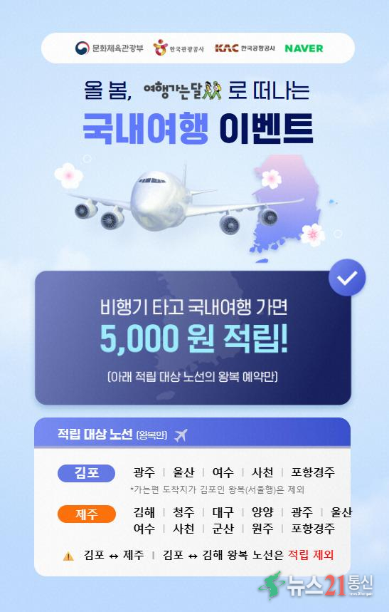 한국공항공사(사장직무대행 박재희)는 3월 16일부터 문화체육관광부, 한국관광공사, 네이버와 함께 국내선 왕복 항공권 구매 시 네이버페이 포인트를 제공하는 “여행가는 달” 연계 프로모션을 진행한다. 이번 프로모션은 정부의 지역관광 활성화 기조에 맞춰 추진한다. 김포-김해, 김포-제주 노선을 제외한 16개 국내 노선(내륙노선 5...