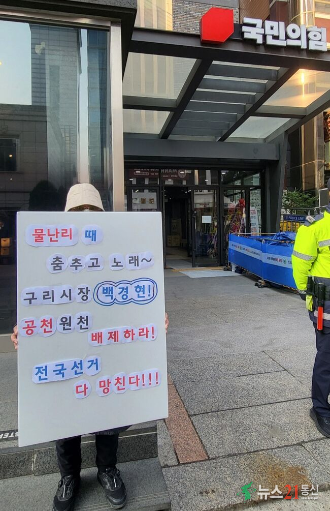 “물난리 때 춤추고 노래한 시장 안 돼”… 구리 당원들, 국힘 중앙당 앞 ‘원천 배제’ 시위