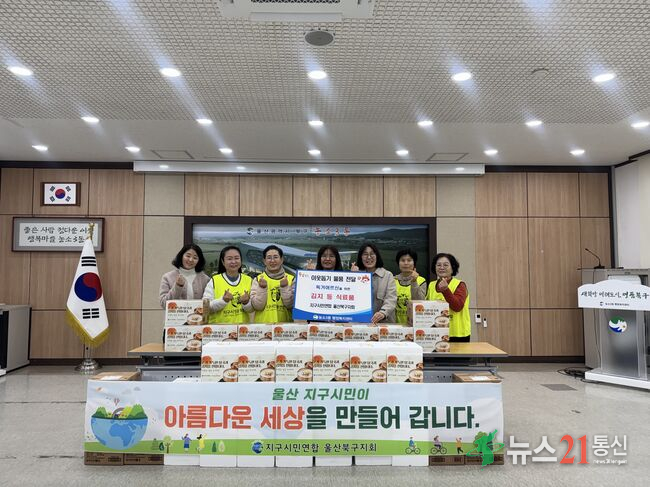 [뉴스21 통신=최병호 ](사진출처=울산북구청)지구시민연합 북구지회는 5일 북구 농소3동 행정복지센터를 찾아 지역 저소득 독거노인세대 지원을 위한 식료품을 전달했다.