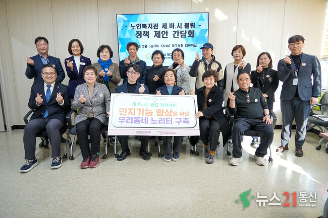 [뉴스21 통신=최병호 ](사진출처=울산북구의회)울산북구의회(의장 김상태) 의원들이 5일 의회 다목적실에서 북구노인복지관 선배시민 모임인 ‘세상을 바꾸는 시니어 클럽(세바시클럽)’과 간담회를 갖고 정책 제안을 청취했다. 조문경 부의장, 손옥선 행정자치위원장, 김정희, 강진희, 임채오 의원이 참가한 가운데 북구노인복지관 홍...