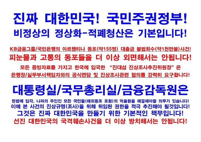 2025년 9월15일, 금융감독원과 국민은행에 대한 민원과 관련하여 서울 국민은행본사에서는 국민은행이 아르헨티나 교민상대 대출금 회수과정(2002년~2007년)에서 현지법(정부시행령 및 중앙은행지침)을 위반하여 불법회수, 150여명의 교민에게 약 1000만불이상 피해를 발생시킨 사건에 대하여 피해당사자인 아르헨티나교민이자 진상조사추진위원장(진대섭)이 머나먼 이국땅을 출발, 직접 조국 대한민국을 방문하여 그동안 금감원과 국민은행측이 민원에 대해 소극적이고 불성실한 답변으로 일관(관련 자료가 없다는 이유)해 왔기에 모든 관련자료목록 및 자료, 진상조사목록(한국에 거주중인 사건당시 최종적인 현지지점장과 아르헨티나에서 잘 살고있는 청산책임자를 비롯한 국내 및 현지 진상조사필요 대상 등)과 그동안의 민원자료들을 제출하고 “최고경영진의 공식진상조사착수결정”을 촉구하였다