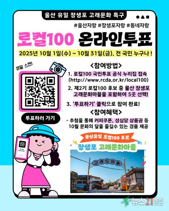 서동욱 남구청장은 “장생포 고래문화마을은 우리 울산의 관광 랜드마크이자 이번 대국민 투표를 통해 고래문화마을이 울산을 넘어 대한민국과 전 세계가 주목하는 문화관광 매력으로 다시금 인정받을 수 있도록 지지와 투표를 바란다”며 “로컬100 공식 누리집에서 진행되는 온라인 국민투표에서 고래문화마을에 소중한 한 표를 행사해 달라”고 강조했다.