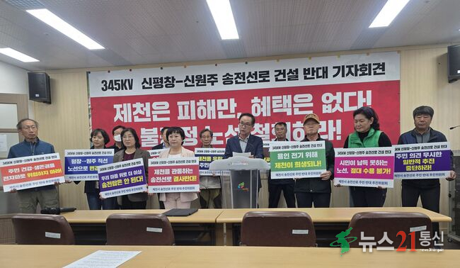 23일 제천시청에서 제천 송전선로 반대 추진위가 반대 기자회견을 하고 있다.