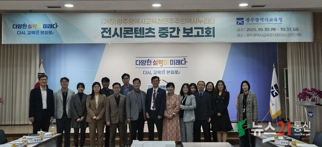 [뉴스21통신/장병기] 광주시교육청(교육감 이정선)은 30~31일 본청 대회의실에서 ‘(가칭)광주시교육청민주주의역사누리터(이하 역사누리터) 전시콘텐츠 중간보고회’를 개최했다.   이번 보고회는 역사누리터 전시콘텐츠 설계 방향을 점검하고, 자문위원 및 관계 전문가의 의견을 공유하기 위해 마련됐다. 보고회에는 역사분야 전...
