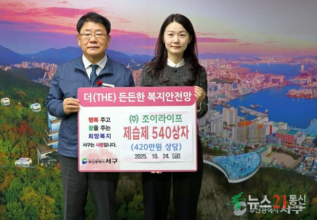 공한수 서구청장은 “소외된 이웃을 위해 따뜻한 마음을 전해주신 (주)조이라이프에 감사드린다”며 “기탁된 성품은 도움이 필요한 취약계층에게 소중히 전달하겠다”라고 밝혔다.