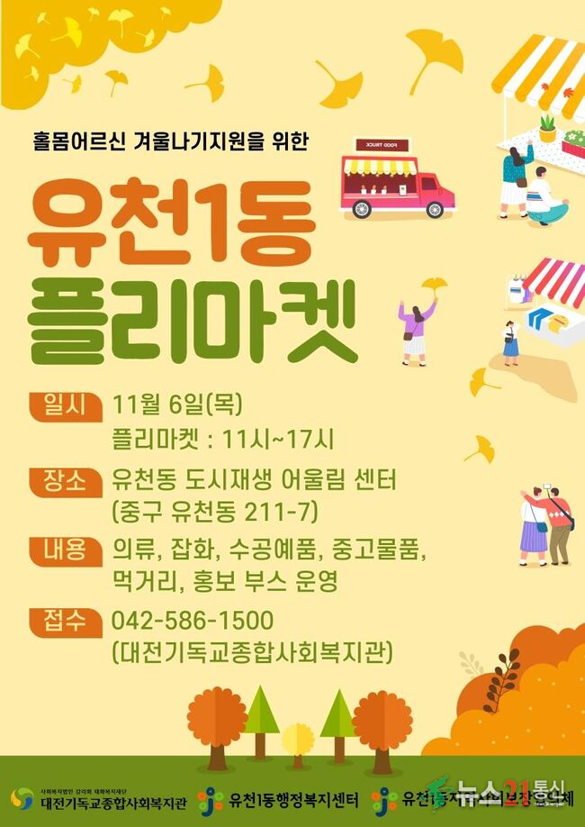 대전 중구 유천1동(동장 김성아)는 오는 6일, 유천1동 지역사회보장협의체(위원장 김도열) 주관으로 유천동 도시재생 어울림센터 일대에서 『제2회 유천1동 플리마켓』 행사를 개최한다고 밝혔다.이번 플리마켓은 홀몸 어르신의 따뜻한 겨울나기 지원을 위한 나눔 행사로, 유천1동 지역사회보장협의체, 대전기독교종합사회복지관, 유천1동 ..