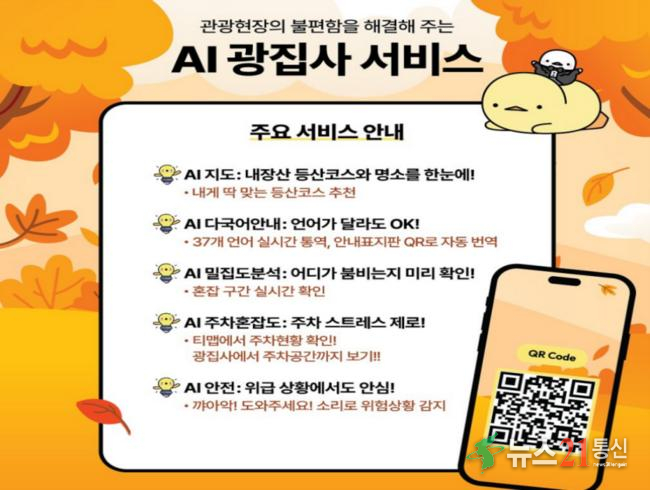 국립공원공단 내장산국립공원사무소는 지난 10월 31일부터 인공지능(이하 ‘AI’) 기반 관광혁신 실증서비스인 ‘AI 광집사(관광현장의 불편을 해결해주는 AI집사)’를 선보인다고 밝혔다. 이번 사업은 정부 AI 대전환 정책과 지역관광 균형성장 전략에 발맞추어 가을 단풍철 내장산을 찾는 탐방객들의 불편을 해소하고 안전...