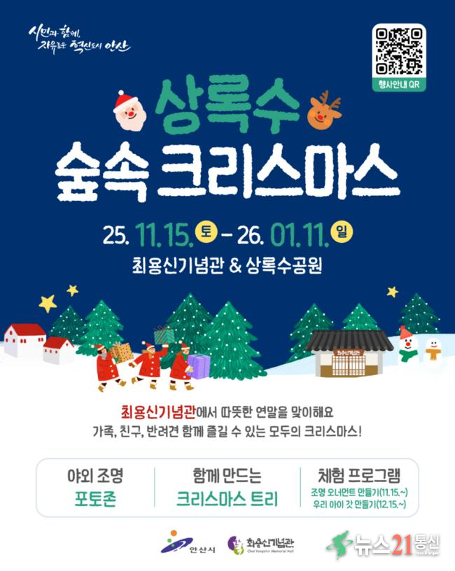 안산시(시장 이민근) 최용신기념관은 오는 15일부터 내년 1월 11일까지 최용신기념관 및 상록수공원 일원에서 시민과 함께하는 체험행사 ‘상록수 숲속 크리스마스’ 행사를 운영한다고 12일 밝혔다.이번 행사는 최용신 선생의 나눔과 공동체 정신을 되새기며, 가족과 이웃이 함께 따뜻한 연말 분위기를 나눌 수 있는 참여형 문화 프로.