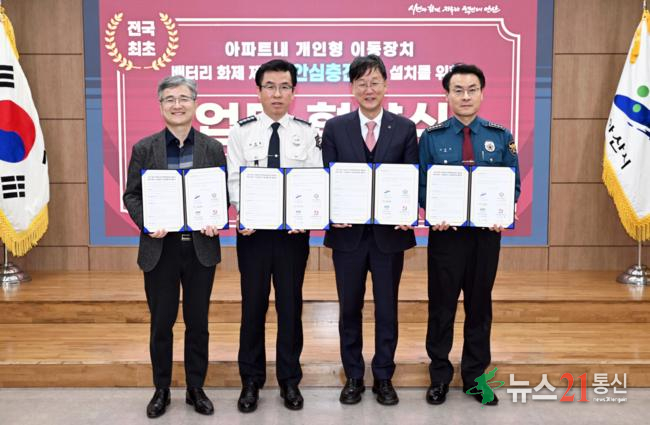 안산시(시장 이민근)는 지난 10일 안산시청 제1회의실에서 안산소방서 등 4개 기관과 아파트단지 내 개인형 이동장치(PM : Personal Mobility) 배터리 ‘안심 충전소’ 설치를 위한 업무협약(MOU)을 체결했다고 11일 밝혔다.최근 개인형 이동장치(전동킥보드 등)를 가정 내에서 충전하는 과정에서 발생하는 배터리 화재로 시민 불안감이 커지는 ...