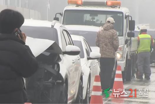 오늘(5일) 오전 9시 7분, 청주시 청원구 3순환로 오동분기점 지상도로에서 화물차와 승용차 등 9대가 연쇄 추돌하는 사고가 발생했다.