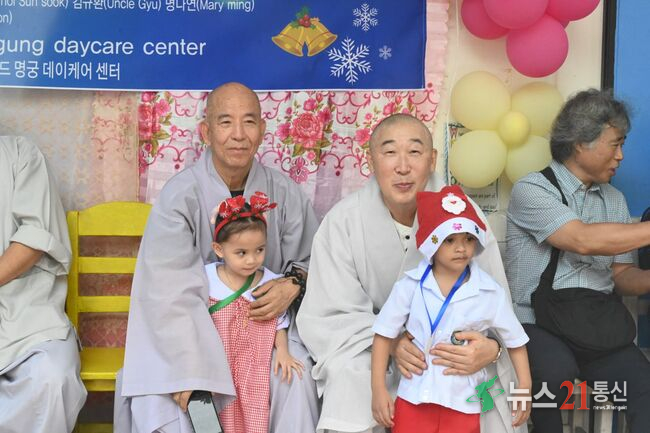명궁데이케어센터에서 아이들과 기념촬영을 하고 있는 명궁스님과 덕문스님의 모습.