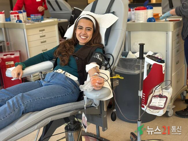 해외사진1_수료기념 특별봉사에 나선 신천지 요한지파 워싱턴DC교회 수료생이 헌혈을 하고 있다.