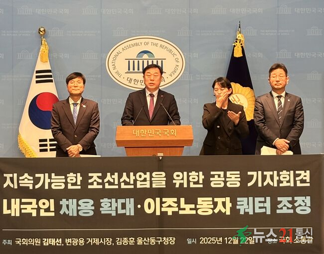 [뉴스21 통신=박정임기자 ][사진제공= 울산 동구청]조선업 구조개선·내국인 채용 확대 촉구김종훈 동구청장 변광용 거제시장 김태선 국회의원 국회 소통관에서 기자회견◈ 김종훈 울산 동구청장은 변광용 거제시장, 김태선 국회의원과 함께 12월 22일 오전 11시 20분 국회 소통관에서 공동 기자회견을 열고, 조선산업의 지속 가능한 성장..