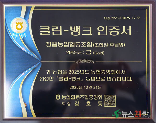 [뉴스21통신/김문기기자]=전북특별자치도 정읍농협이 농협중앙회 주관 2025년도 자산건전성 평가에서 5년 연속'클린뱅크'인증을 받았으며,우량 농협을 의미하는 '금(金)등급'을 획득했다. 이번 금(金)등급은 전국 1,110개 농축협 중 106개 사무소에 수여된 높은 수준의 인증이다.정읍농협은 전북 지역 92개 농축협중 금등급을 획득한 1...