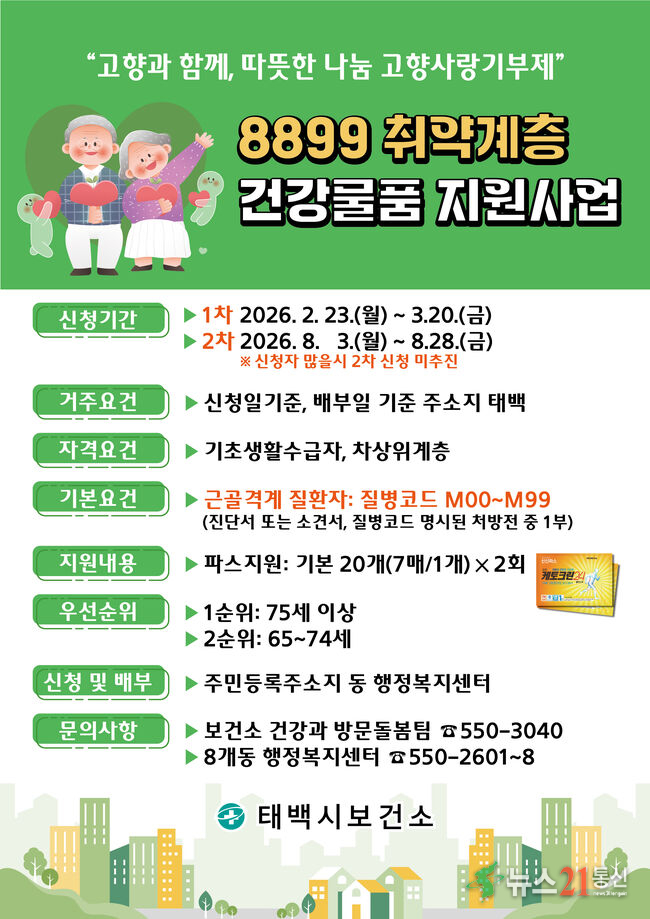 태백시(시장 이상호)는 고향사랑기금을 활용해 관절염 등 근골격계 질환으로 어려움을 겪는 관내 취약계층 어르신을 대상으로 『8899 취약계층 건강물품 지원사업』을 추진한다고 밝혔다.이번 사업은 경제적 부담으로 치료나 비급여 물품 구입이 어려운 어르신들의 통증 완화와 건강한 노후 생활을 지원하기 위해 마련됐다.지원 대상은 태..