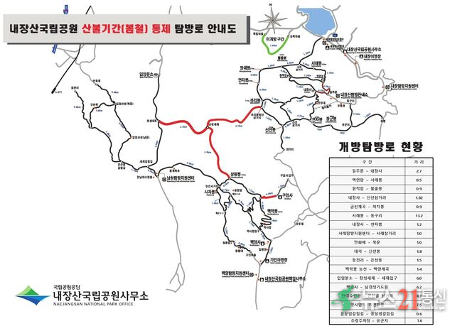 [뉴스21통신/김문기기자]=국립공원공단 내장산국립공원사무소가 봄철 산불 예방을 위해 산불 위험이 높은 일부 탐방로를 대상으로 2월 15일부터 4월 30일까지 출입을 통제한다. 출입이 통제되는 탐방로는 까치봉능선삼거리~순창새재(2.6㎞), 장성새재~상왕봉(4㎞), 구암사~백학봉 능선(0.9㎞) 총 3개 구간 7.5㎞이며, 해당 구간을 제외한 탐방...