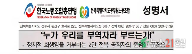 노조는 이어 “공무원을 정치적 희생양으로 삼는 공세를 중단해야 한다”고 정치권에 촉구했다.
