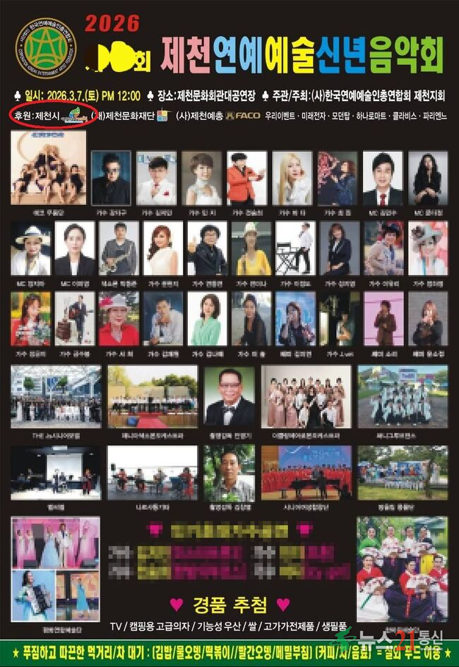 공연은 지역 문화 시설에서 개최 예정이었고, 다수 출연진과 경품 행사까지 포함된 대형 행사다. 포스터에는 제천시 명칭과 마크가 공개적으로 노출됐다.