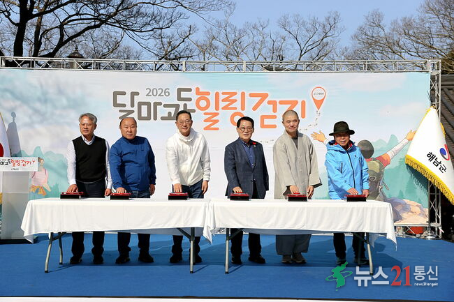 [뉴스21통신/장병기] 콧구멍이 벌렁벌렁, 발바닥이 간질간질. 다도해의 바람에 실려 땅끝해남에 봄이 성큼 당도했다. 28~29일 주말동안 땅끝마을 아름다운 절 미황사를 품은 달마산 일원에서‘달마고도 힐링걷기’행사가 열렸다. 전국 각지에서 모인 걷기 여행객들은‘걷는 순간이 곧 힐링’이라는 테마로 남도의 금강산이라 불..