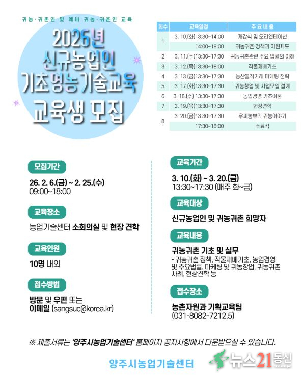 양주시는 농촌지역으로 이주한 귀농․귀촌인과 예비 귀농인의 안정적인 농촌 정착을 지원하기 위해 ‘2026년 신규농업인 기초영농기술교육’ 교육생을 모집한다. 이번 교육은 예비농업인과 귀농․귀촌 초기 농업인을 대상으로 영농 전반에 대한 기초 지식과 현장 중심의 실용 기술을 체계적으로 제공하기 위해 마련됐다. 교육은 ...