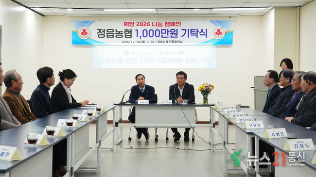 전북특별자치도 정읍농협은 12월 18일, 연말연시를 맞아 어려운 이웃을 돕기 위해 총 1,570만원 상당의 성금과 물품을 정읍시에 기부하며 지역사회에 따뜻한 사랑나눔을 했다. 농협은 이날 희망나눔 성금 1,000만원을 정읍시에 기탁하고, 이와 별도로 570만원 상당의 라면을 정읍농협 관할 5개동의 공유냉장고에 기탁했다. 이번에 전달된 성금과 ...