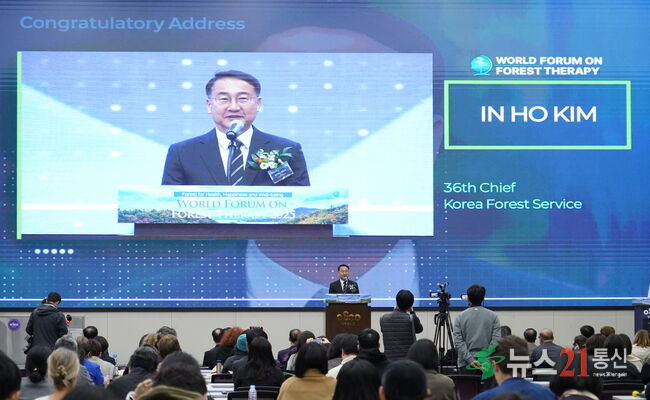 김인호 산림청장, 세계산림치유포럼 참석 김인호 산림청장이 27일 충청북도 청주에서 열린 '제2회 세계산림치유포럼'에 참석했다. 김 청장은 “한국의 산림치유 정책은 건강한 국민, 건강한 사회에 기여하는데 최우선 목표를 두고 있다."라며, "산림치유 산업의 성장을 위한 법적, 제도적 지원을 강화하는데 더욱 노력해 나가...