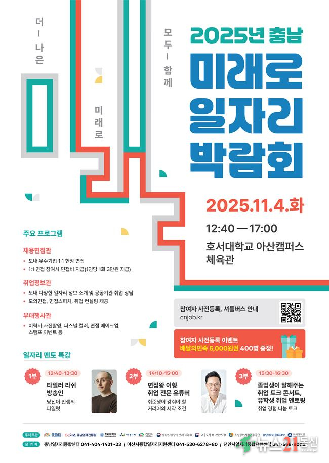 충남도는 다음달 4일 호서대 아산 캠퍼스에서 ‘2025년 충남 미래로 일자리 박람회’를 개최한다고 30일 밝혔다.도가 주최하고, 충남경제진흥원과 호서대, 아산시, 천안시, 충남지방중소벤처기업청 등 민관이 공동 주관하는 이번 박람회는 도내 양질의 일자리를 창출하고 취업 시장을 활성화하고자 기획했다.이번 행사는 ‘더 나은 .