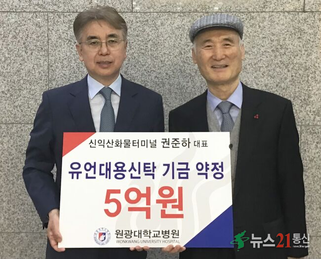 지난 24일(금) 서울 서초구 소재 늘봄웰봄에서 신익산화물터미널 대표 권준하(81세)씨가 원광대학교병원 서일영 병원장에게 어려운 환자를 위해 써 달라며 일금 오억원(\500,000,000원)을 기부했다. 국내 최초로 30억원 규모의 유언 대용 신탁방식의 기부로 이는 펀드에 가입 후 발생되는 수익금을 기부하고 기부자 사후에는 원금과 수익금을 기..