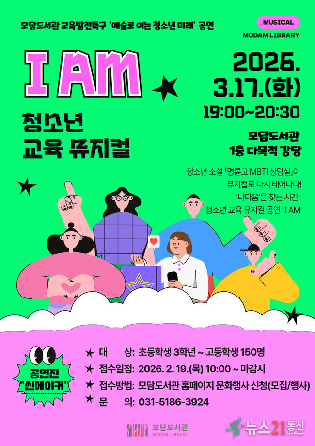 김포시모담도서관은 2026 교육발전특구 사업의 일환으로 청소년을 대상으로 한 공연 ‘청소년 뮤지컬 I AM’을 3월 17일(화) 19시부터 20시 30분까지 모담도서관 1층 다목적강당에서 운영한다.이번 공연은 김포시 교육발전특구 추진 방향에 따라 기획된 프로그램으로, 청소년 소설 ‘명륜고 MBTI 상담실’을 원작으로 창작된 청소년 ..