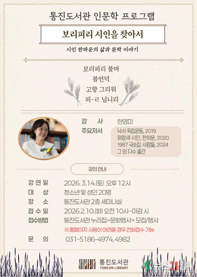 김포시 통진도서관은 한하운 시인의 삶과 문학을 다룬 인문학 프로그램 ‘보리피리 시인을 찾아서’를 오는 3월 14일(토) 오후 12시부터 통진도서관 세미나실에서 운영한다. 「파랑새 시인, 한하운」의 한영미 작가가 진행하는 이번 강의는, 한센병 환자로 고통과 외로움 속에서 자유를 꿈꿨던 한하운 시인의 삶을 조명하며, 전쟁과 분.