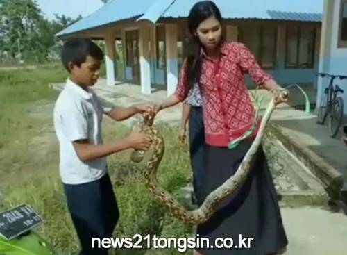 ▲  맨손으로 2.7m 뱀 잡은 인도네시아 교사 / 일간 콤파스-연합뉴스인도네시아의 여교사가 학교에 들어온 2.7m 길이 비단뱀을 맨손으로 잡아 화제가 됐다.