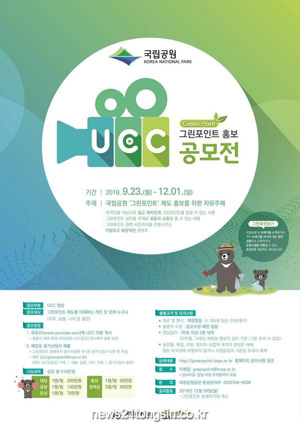 ▲ 공모전 홍보 포스터환경부 산하 국립공원공단(이사장 권경업)은 국립공원 그린포인트 제도를 홍보하기 위한 ‘그린포인트 손수 제작 영상물(UCC) 공모전’을 9월 23일부터 12월 1일까지 개최한다.