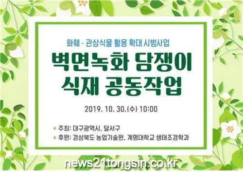 (뉴스21통신/유재원기자) = 대구시는 화훼·관상식물 조성 시범사업으로 30일 오전 10시 달서구 용산동 906번지 일원에서 계명대학교 학생 및 교수, 시·도 및 구청관계자, 시민 등 100여명이 참여해 담쟁이, 아이비 등 관상식물 2,000본을 식재하는 등, 벽면녹화사업을 추진해 화훼농산물 소비를 촉진하고 도시환경을 개선한다.