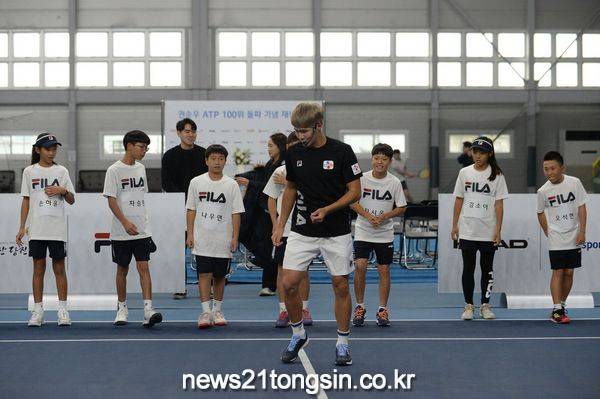 권순우의 매니지먼트 회사인 스포티즌은 21일 오후 서울 구로구 귀뚜라미 크린 테니스코트에서 열린 남자프로테니스(ATP) 100위 돌파 기념 재능 기부 행사를 열였다.