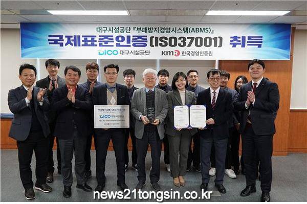 (대구=뉴스21통신) 유재원기자 = 대구시설공단은 한국경영인증원으로부터 20일 대구시 산하 공공기관 중 최초로 ‘부패방지경영시스템(ISO37001)’인증을 취득했다.