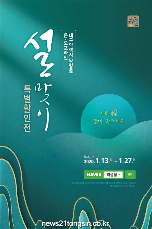 (대구=뉴스21통신) 유재원기자 = 대구약령시 한방제품 특화몰인 ‘동대구역 메디시티대구 명품브랜드 판매장’(이하 메디시티대구 판매장) 및 ‘대구 약령몰’(이하 약령몰)에서 우수・인기 한방제품을 선별하여 2020년 설맞이 특별할인행사를 개최한다.