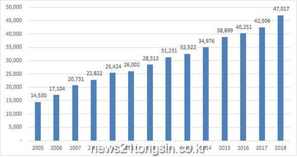 ▲  외국인주민 인구증가 추이(자료=대구시 제공)한편, 대구시 결혼이주민 등 외국인주민은 47,017명(2018.11.1. 기준)으로 지속적인 증가 추세를 보이고 있으며, 대구시 인구의 1.9% 수준이다.
