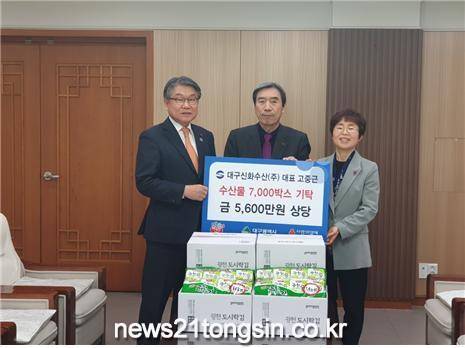 (대구=뉴스21통신) 유재원기자 = 대구농수산물도매시장 내 수산부류 시장도매인 대구신화수산(주)(대표 고중근)은 5천6백만원 상당의 김 7,000박스를 대구지역 어려운 소외계층에 전달했다.
