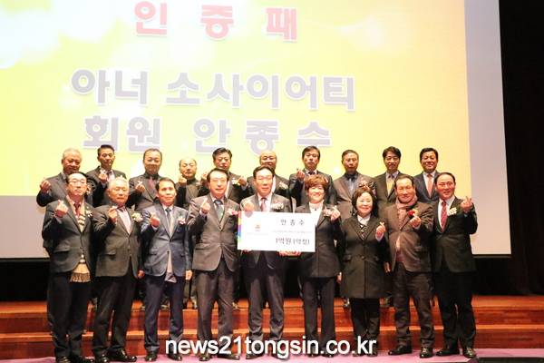 ▲  안종수 회장 아너소사이어티 회원가입 인증패수여안 회장은 2013년 대구시태권도협회 부회장 시절 한국법무보호복지공단과 연을 맺으며 체육인 3백명을 모아 법무보호공단 대구, 경북지부 체육위원회를 창립하여 합동결혼식 및 취업알선, 양로원 위문 등 수 많은 나눔을 실천 해오고 있다.