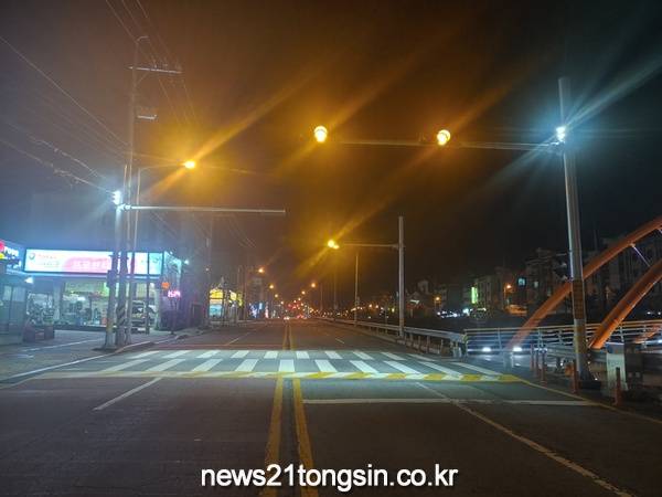 ▲  석적읍 광암천 인도교 앞 횡단보도 LED 집중조명시설이번에 설치하는 횡단보도 LED 집중 투광등은 국도 4호선 북삼읍지역과 국도67호선 석적읍 등 17개소에 대하여 도비보조 포함 1억3천만원을 들여 투광기 76개를 설치한다.
