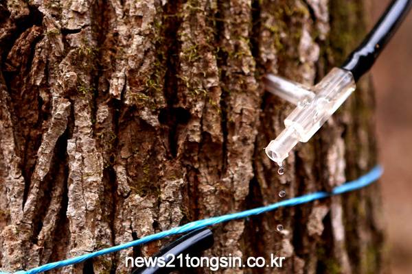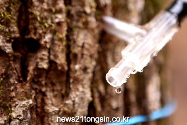 인제군 남면 상수내리 일대 산자락에서 봄의 전령사로 불리는 고로쇠 수액 채취가 시작돼 상수내리 작목반 반원들이 고로쇠 수액을 채취하고 있다.