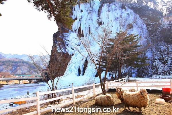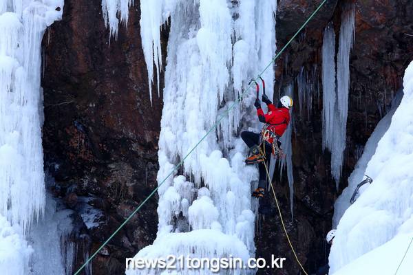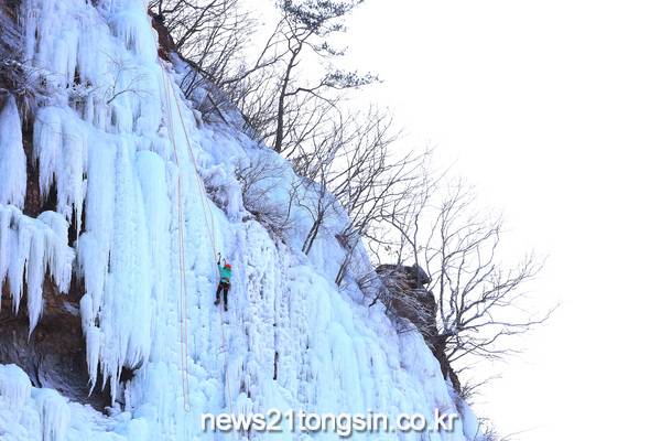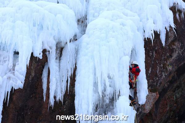 인제군 용대리 매바위 폭포가 최근 이어진 한파로 인해 거대한 빙벽을 이루며 이를 즐기기 위한 빙벽 동호인들의 발길이 이어지고 있다.