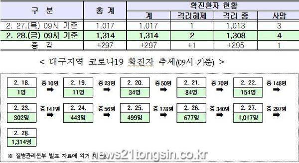 금일 질병관리본부의 공식 발표에 따르면 28일 오전 9시 현재, 대구시 코로나19 확진환자는 전일 오전 9시 대비 297명이 증가되어, 총 1,314명의 확진환자가 발생하였다.