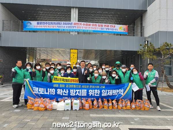 용문면 새마을회 회원 60여명은 2월 24일부터 매주 월요일과 수요일에 관내 마을회관과 경로당을 비롯하여 면사무소와 용문역사 등 다중이용시설의 방역 소독 활동을 실시하고 있다.