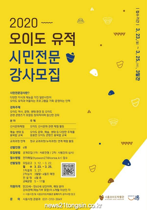 모집 관련 자세한 내용은 시흥오이도박물관 홈페이지(http://oidomuseum.siheung.go.kr) 공지사항의 <2020 </span>오이도 유적 시민전문강사 모집> 글을 참고하면 된다.