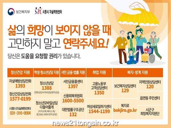 자살예방센터는 시흥시의 생명존중 문화를 확산하고 시민의 정신건강 증진을 위해 ▲자살문제 상담 ▲자살유족 지원서비스 ▲자살예방교육 등 여러 사업을 활발히 진행 중이다. 관련 내용에 대한 모든 문의는 시흥시자살예방센터(031-316-6664)로 전화해 안내받으면 된다.