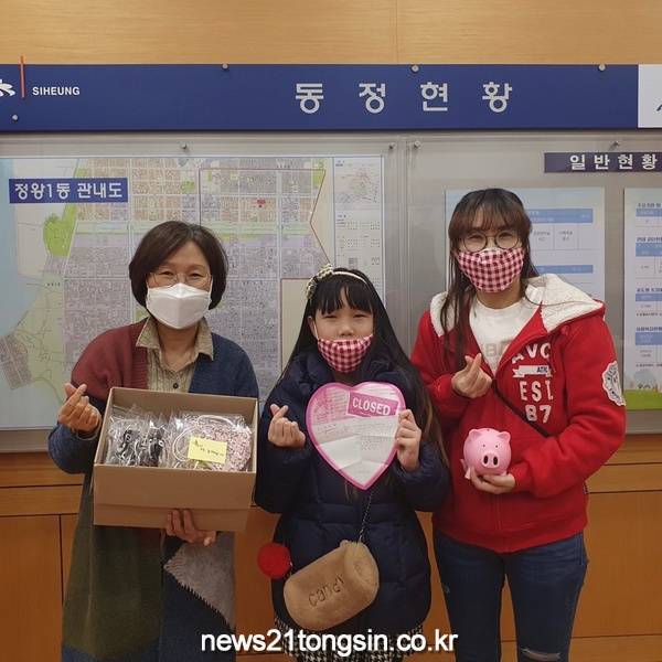 나눔의 주인공은 정왕초등학교 5학년에 재학 중인 박주원(12세) 양. 어머니의 손을 잡고 정왕1동 행정복지센터에 들어온 박주원 양은 수줍게 한 상자를 내밀었다. 상자 안에 들어있던 것은 어머니와 함께 직접 만든 마스크와 열심히 용돈을 모아 배를 가득 채운 돼지 저금통.