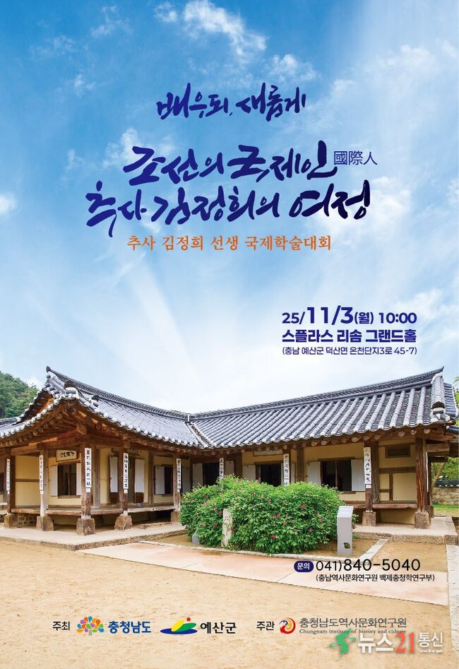 추사국제학술대회 포스터[뉴스21 통신=이종수 ]예산군은 충청남도와 함께 오는 11월 3일 덕산면 스플라스 리솜 대연회장에서 ‘2025 추사국제학술대회’를 개최한다. 이번 학술대회는 조선 후기의 대표적 학자이자 예술가인 추사 김정희 선생의 학문과 예술세계를 조명하기 위해 마련된 행사로 군과 충청남도가 공동 주최하고 충청...