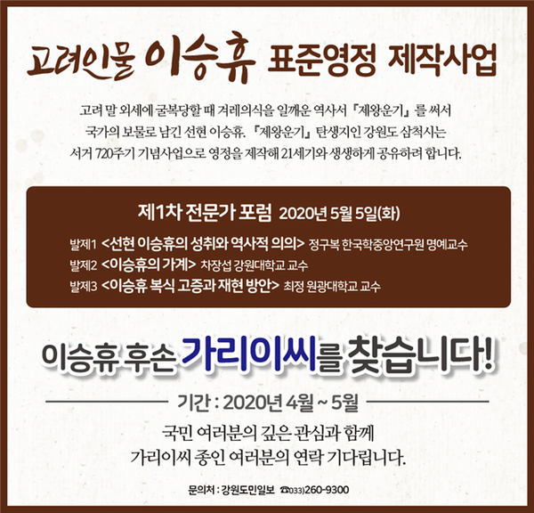 이를 위해 발제자 ▲정구복 한국학중앙연구원 명예교수의‘이승휴의 성취와 역사적 의의’▲차장섭 강원대학교 교수의‘이승휴의 가계’▲최정 원광대학교 교수의‘이승휴 복식 고증과 재현 방안’에 대한 발표 후 전문가 토론으로 진행된다.